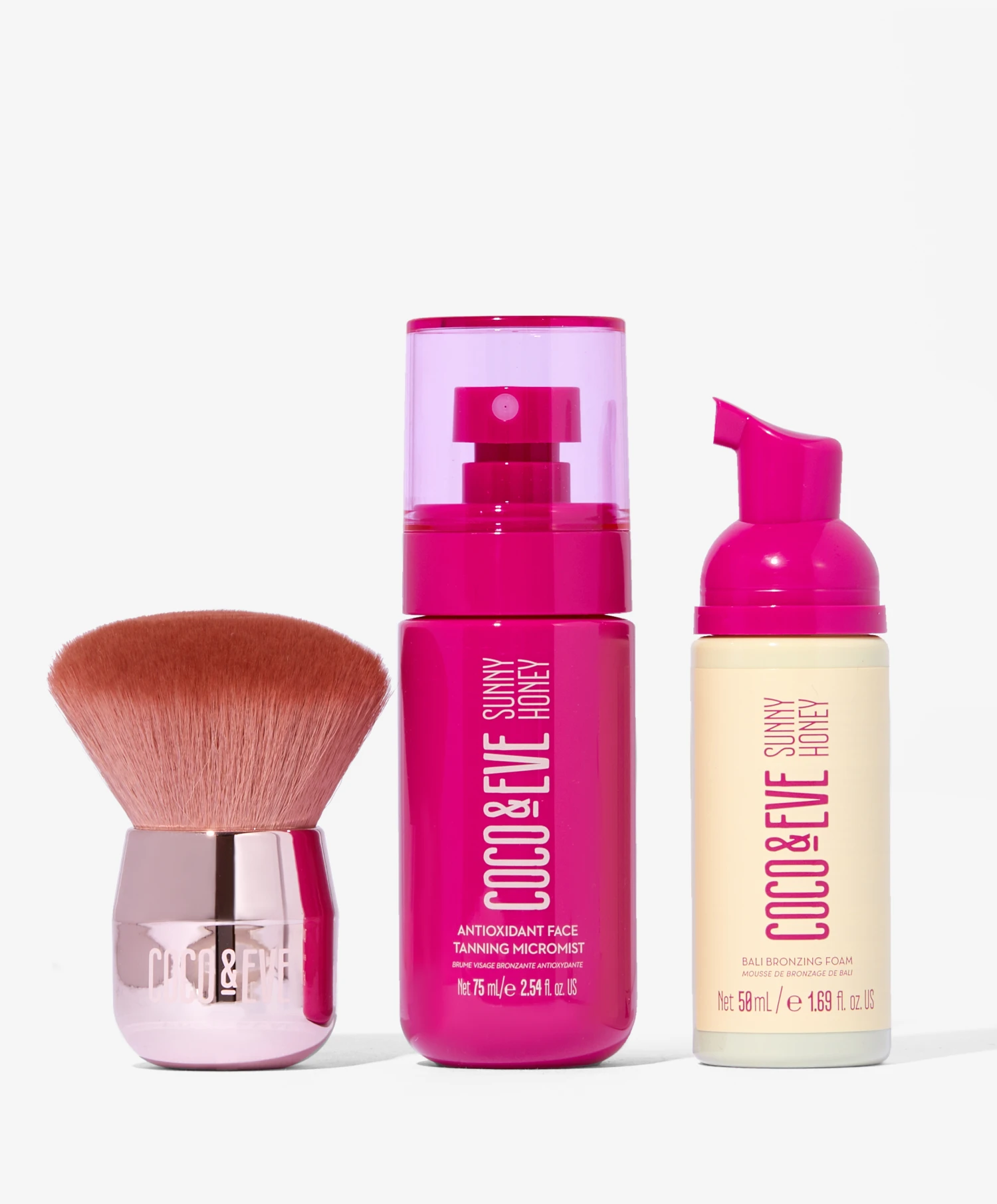 Master the art of a flawless faux glow with the Coco & Eve Tan Masters Kit. This three-piece medium tanning set features a face tanning mist, medium bronzing foam, and a face kabuki brush that let you create that perfect sunkissed, healthy glow to the skin, without the risk of creating a streaky tan. Get ready for your best tan yet…